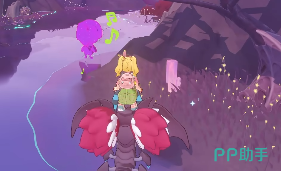 大家传送到黑水峡的魔力之源,然后将视角转向头骨的方向,在头骨的旁边记得停顿一下能看到音符,此时我们在这个地点进行翻找就能发现第1个宝箱,然后向着这个头骨方向前进,走到一个紫色矿石地点也就是下图的地方,能看到旁边是有一个小小的发光点,点击翻找一下就能拿到第2个宝藏。