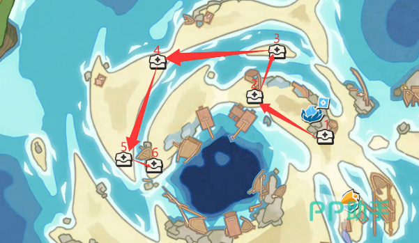 往东南方向继续前进前方的闪光点能找到第4个,接着朝着南方走,在靠近水源的边上翻找能发现第5个,最后一个点位往右方走,闪光点翻找就能发现,当然大家也可以直接参考下图的路线点位来找。