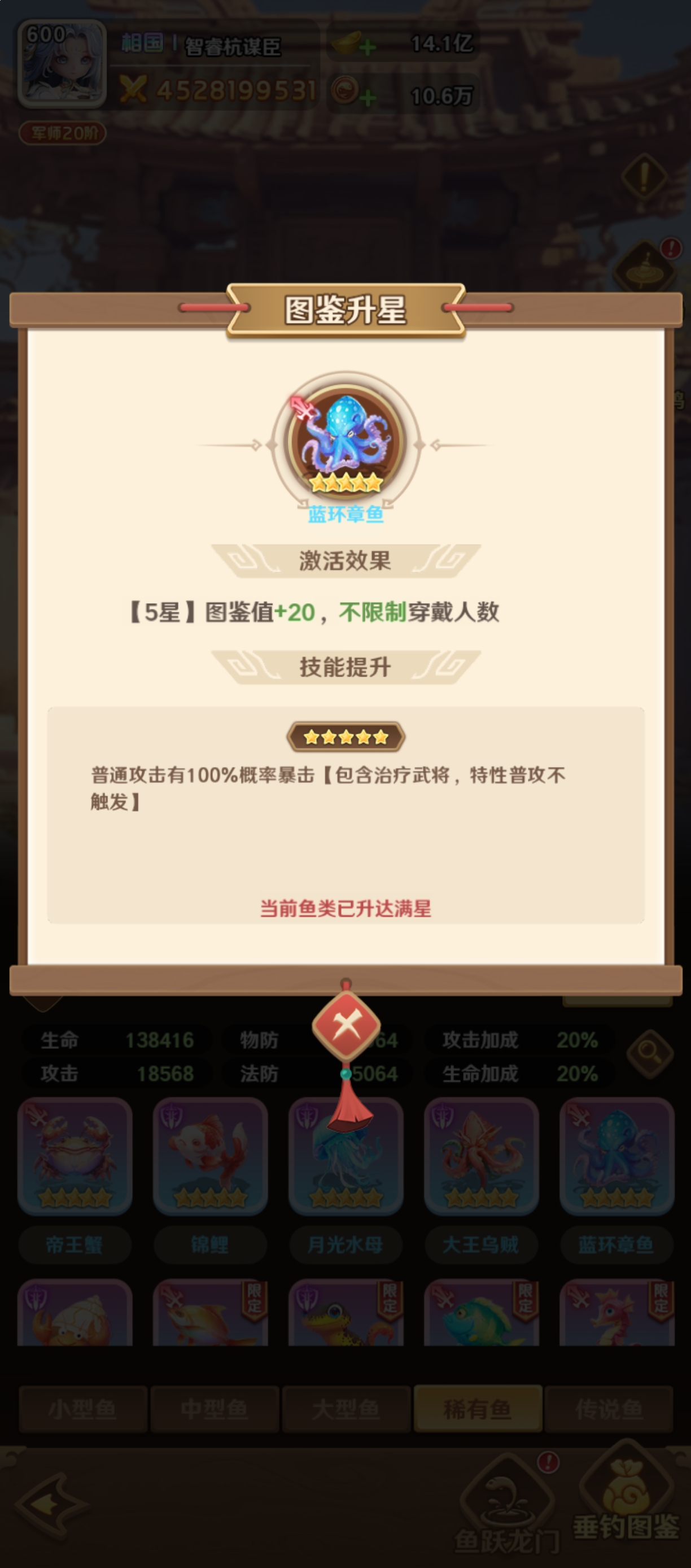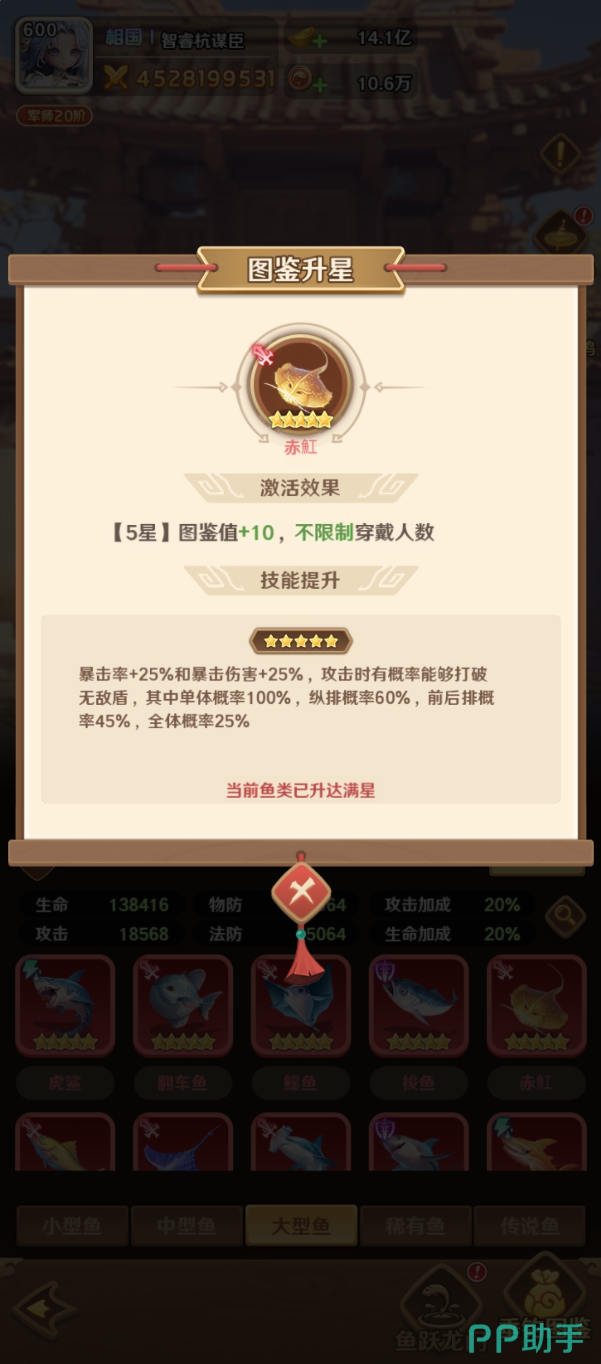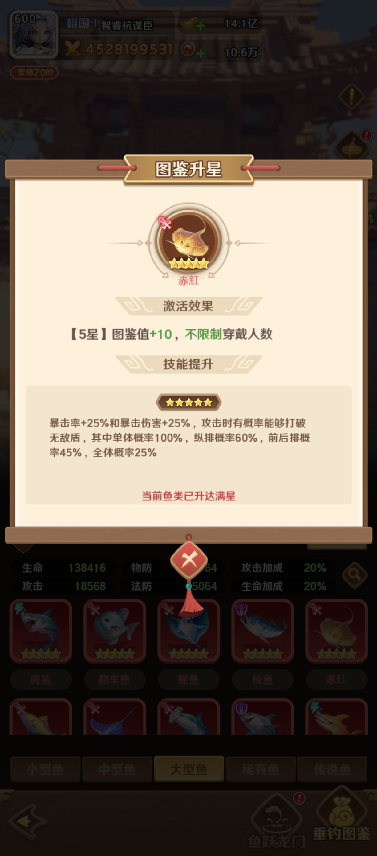 赤魟是一个比较值得关注的鱼类,它的五星激活效果就是直接让暴击率跟暴击伤害各自都增加到25%,并且在攻击的时候,还能够有效的打破无敌的护盾,这样对于关羽来说,不仅仅能够提高他的暴击输出,还能够在一定的程度上克制那些拥有无敌盾的敌人毕竟在整个战场上还会涉及到一些特殊的敌人,它所产生的效果就能够决定最终的胜负。
