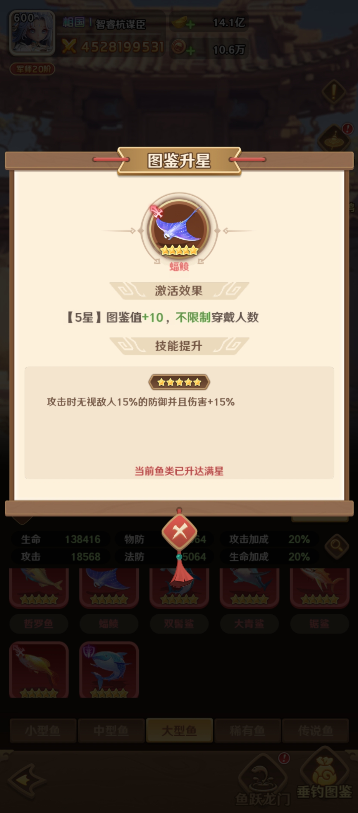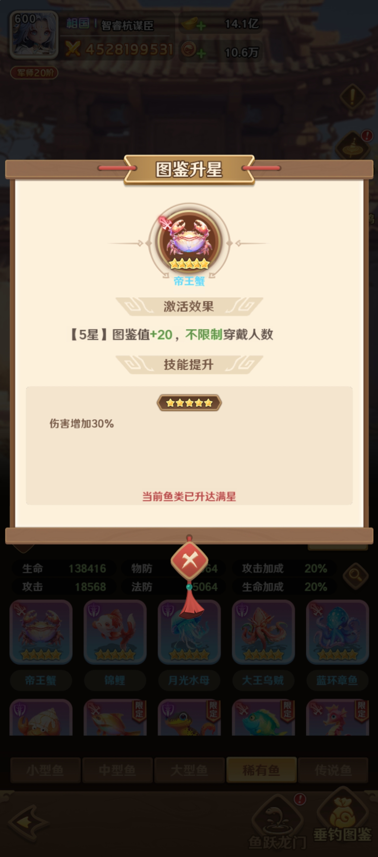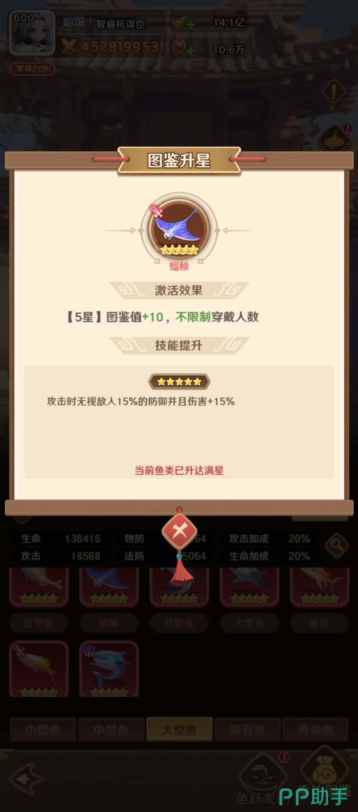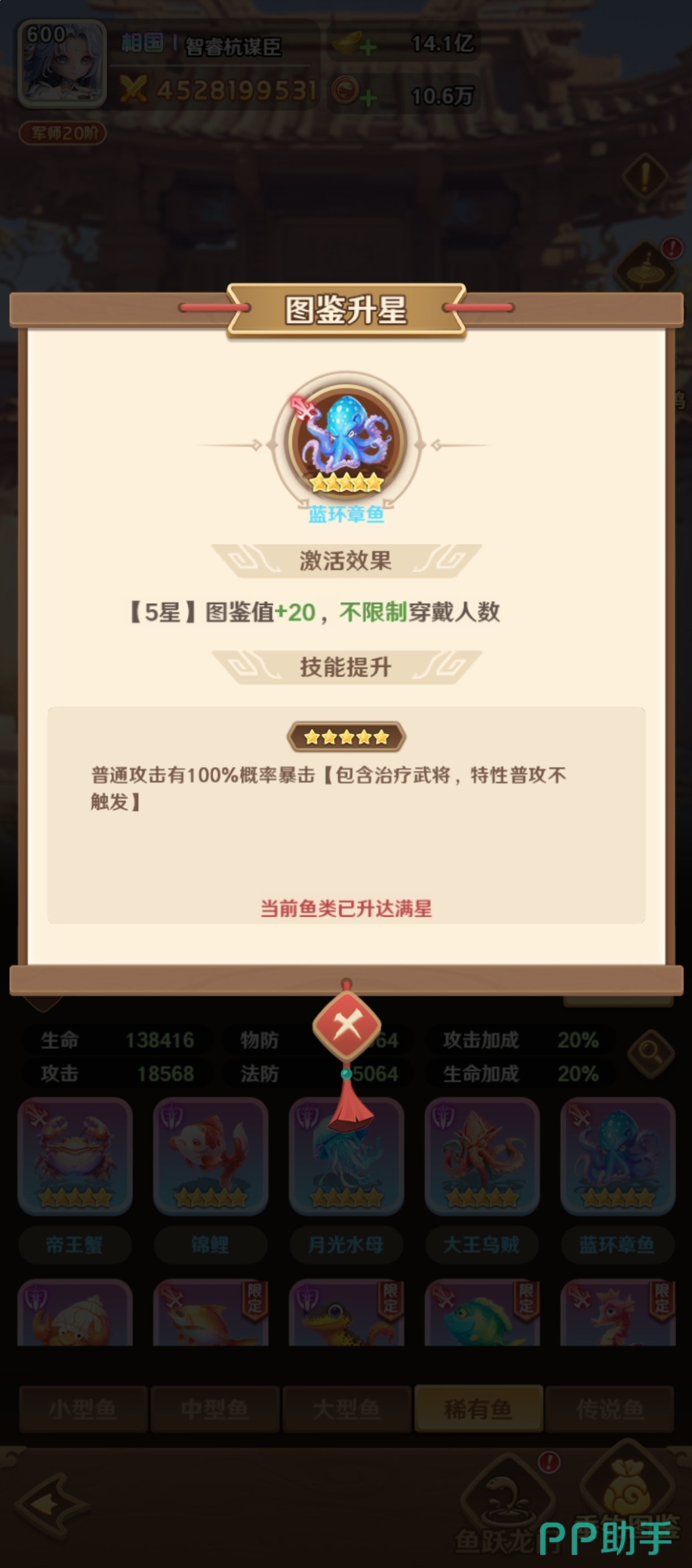 赤魟是一个比较值得关注的鱼类,它的五星激活效果就是直接让暴击率跟暴击伤害各自都增加到25%,并且在攻击的时候,还能够有效的打破无敌的护盾,这样对于关羽来说,不仅仅能够提高他的暴击输出,还能够在一定的程度上克制那些拥有无敌盾的敌人毕竟在整个战场上还会涉及到一些特殊的敌人,它所产生的效果就能够决定最终的胜负。