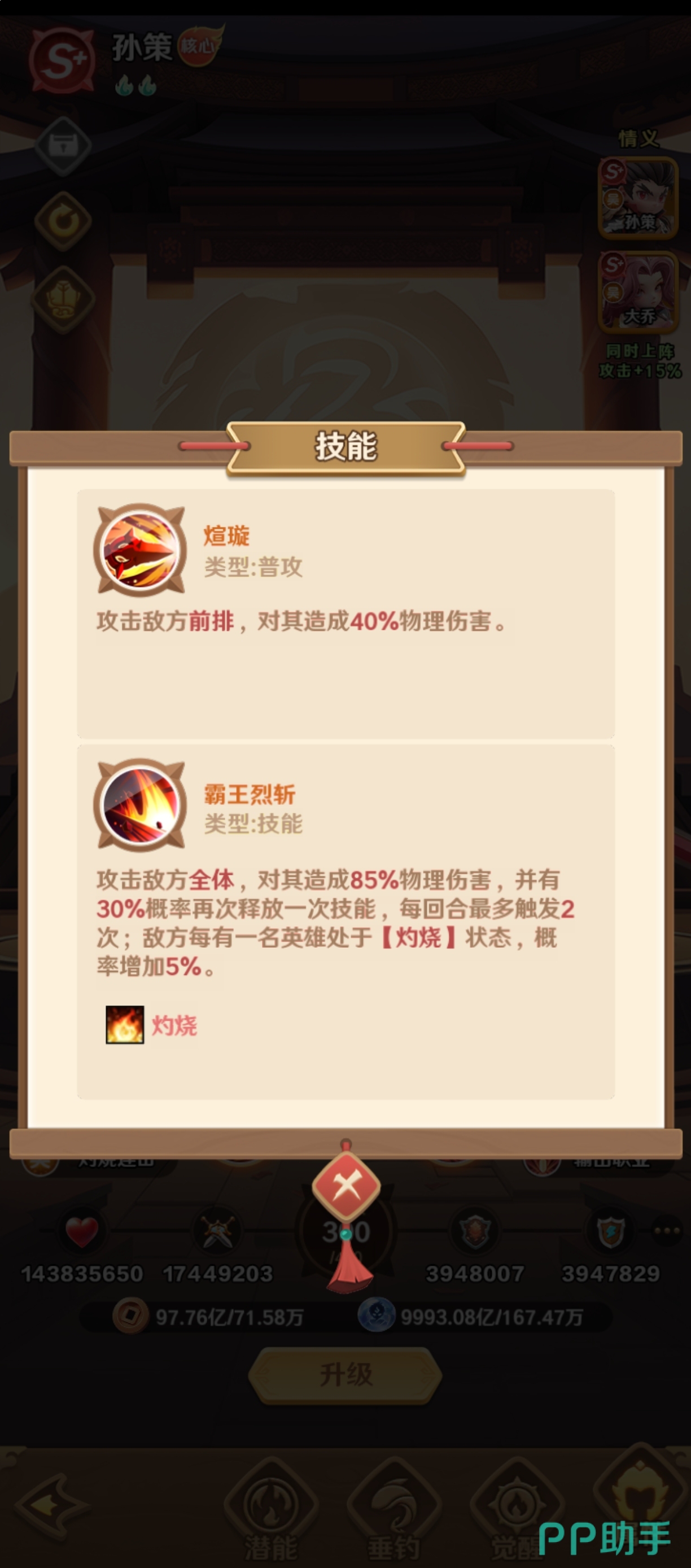 孙策的基础普攻虽无特效,但基础物理伤害数值突出;其核心技能“霸王烈斩”具备85%全屏物理伤害,并自带30%概率二次释放。关键在于:当目标已处于灼烧状态时,该技能额外提升5%重施率——这意味着灼烧不仅是持续伤害手段,更是触发孙策连招链的核心前置条件。