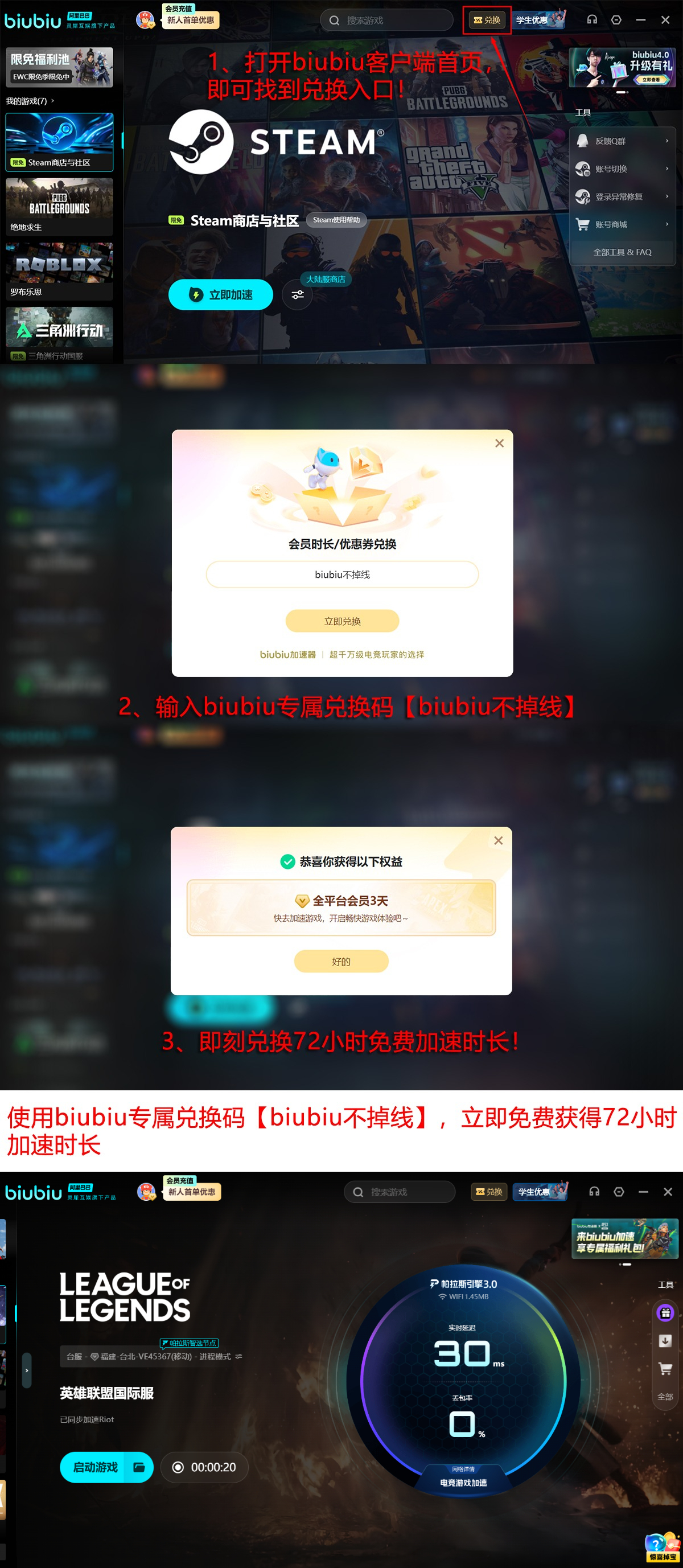 新用户注册后可立即获得24小时全功能免费加速权限;输入专属福利口令【biubiu不掉线】,还可额外激活72小时连续加速服务。两项权益叠加生效,总计享96小时无门槛高品质网络加速体验,全程零费用。
