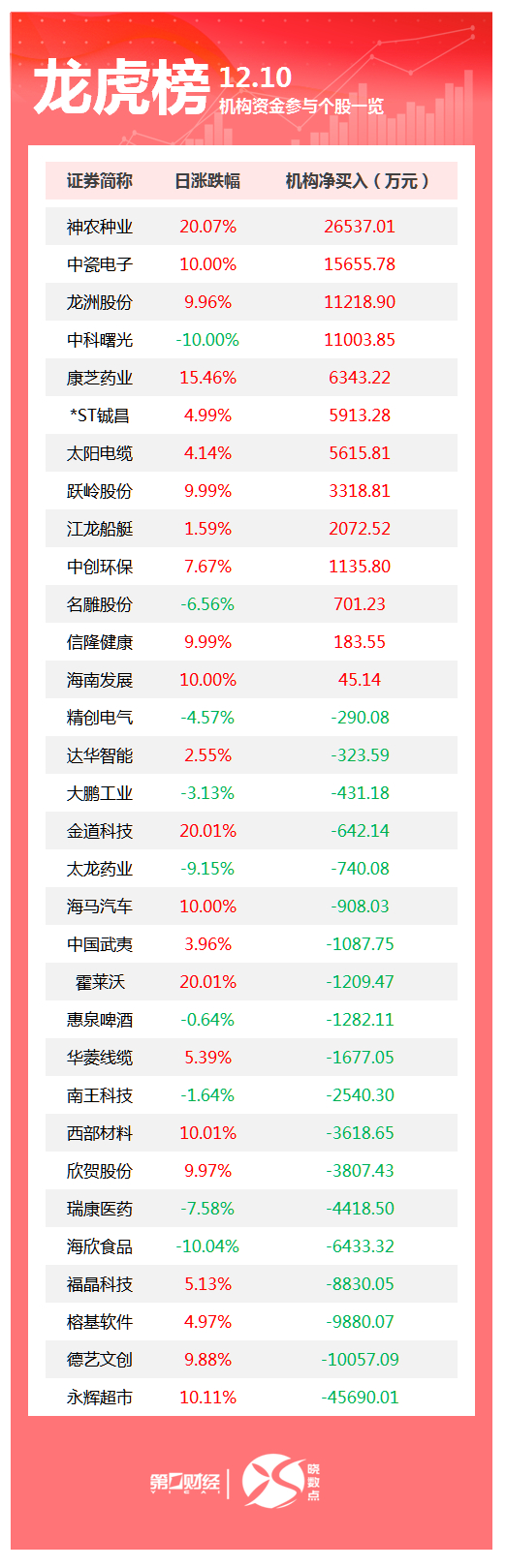 12月10日龙虎榜中,共32只个股出现了机构的身影,有13只股票呈现机构净买入,19只股票呈现机构净卖出。当天机构净买入前三的股票分别是神农种业、中瓷电子、龙洲股份。当天机构净卖出前三的股票分别是永辉超市、德艺文创、榕基软件。