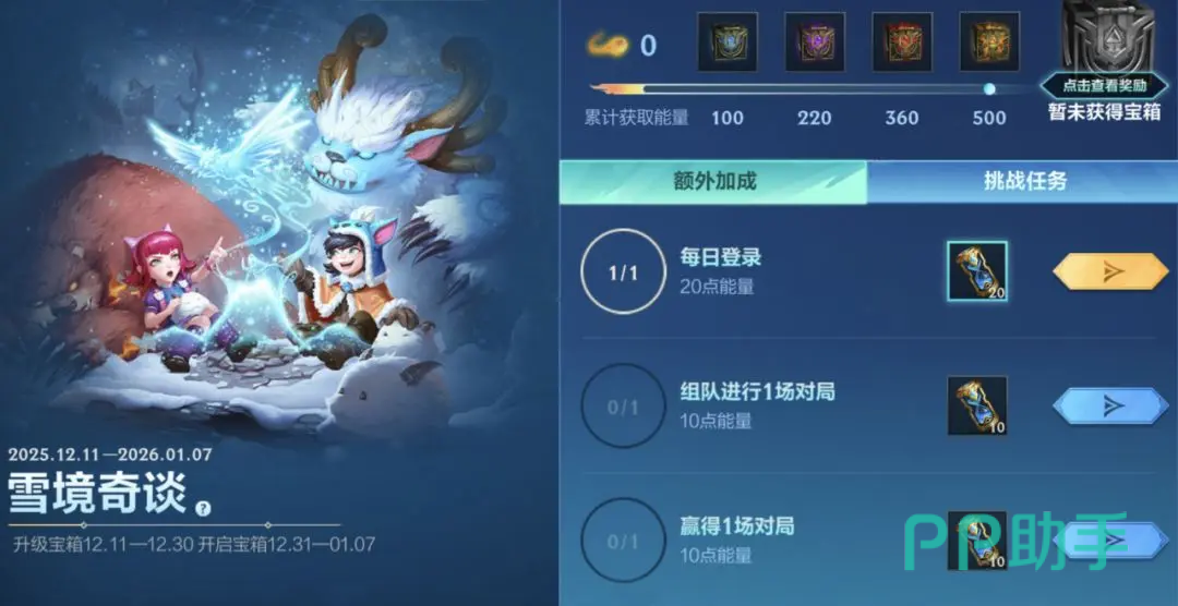 召唤师参与活动就能提升宝箱品质,最高级别的宝箱是钻石宝箱,打开就能随机获得一个史诗皮肤。活动分为不同时期,首先是宝箱升级时期,12月11日到12月30日完成活动任务就能获取能量,用来升级宝箱品质;