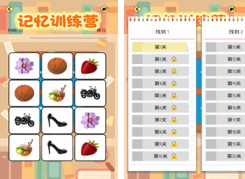 专注认知能力提升的记忆力训练工具型游戏。核心机制为“速记-翻牌-配对”,要求玩家在有限时间内识别并记住散列卡牌背面的图案内容(涵盖食物、交通工具、日常用品等数十类常见图像),随后点击两张相同图案完成消除。关卡节奏紧凑,图像种类覆盖广,难度随进度阶梯式上升,兼顾科学性与娱乐性。