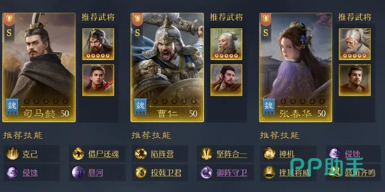 然后是三仙队,也很强势,华佗左慈张角,有超强的续航和稳定出伤,而且这个配队对技能的需求没有那么高,即便是一些紫色品质的技能也可以用。桃园枪(刘关张)也很强势,不过需要一定的投入和运气,主要是关羽抽取成本稍微有点高。