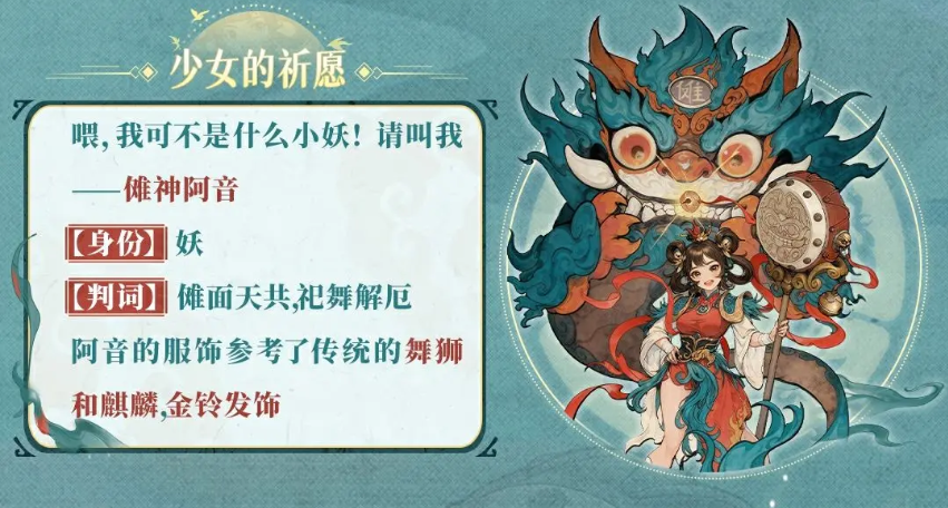 阿音的身份是妖,主要能力就在给友方提供增益方面,她带来的鼓舞效果,能让队内的士气和战斗力提升较高,提高队伍整体输出力度。她的主动技“傩舞”,会让所有部从增加25%攻击和生命,且该效果会贯穿整个战局,这样的神通就属于战场神通,战场神通往往只能在开展后的对战环节发动,效果比较霸道,这孩子总技能效果往往对战局胜负有关键性影响。