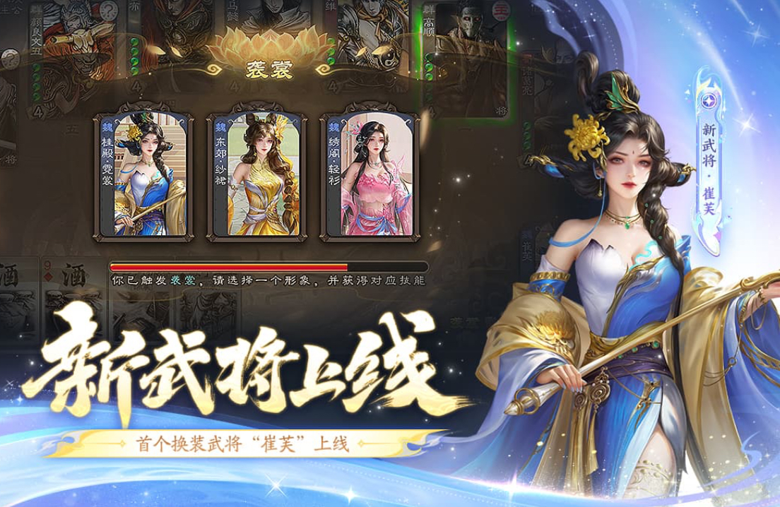 融合RPG成长体系的卡牌策略手游。玩家以主公身份开局,通过招募、升星、进阶等维度培养武将战力,并结合步、骑、弓、术四大兵种间的克制关系制定战术。资源争夺、城池攻防、跨服远征等玩法模块,进一步拓展策略纵深。副本系统覆盖PVE挑战与阶段性目标奖励。