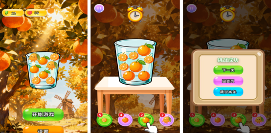 融合图鉴收集与三消逻辑,围绕橘类水果展开主题设计,包含金桔、丑橘等多种真实品种。主界面中央为盛放橘子的容器,底部提供可选橘子类型,玩家通过点击匹配相同品类实现消除,需在倒计时内达成指定消除数量或连击目标。