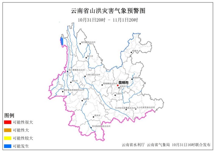 云南网讯(记者 段芃)10月31日,云南省水利厅、云南省气象局联合发布山洪灾害气象预警。