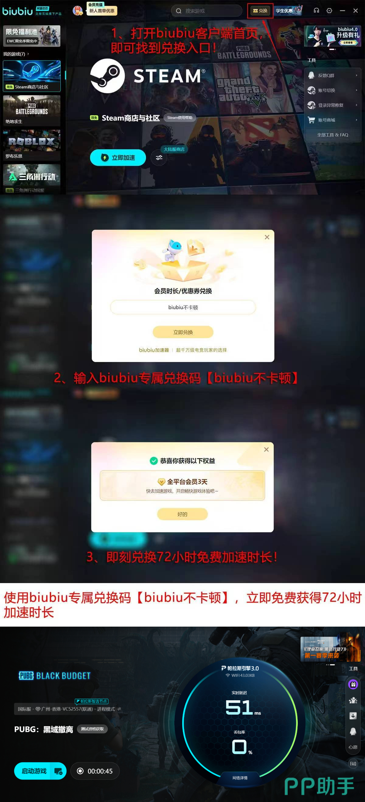 目前官方正开放限时体验通道,用户完成基础任务即可获取正式版测试资格。新注册用户可立即领取24小时全功能免费加速权限;输入专属口令【biubiu不卡顿】,还可额外激活72小时VIP服务,累计享96小时无限制加速体验。全程无需绑定支付方式,零门槛验证网络优化实效。