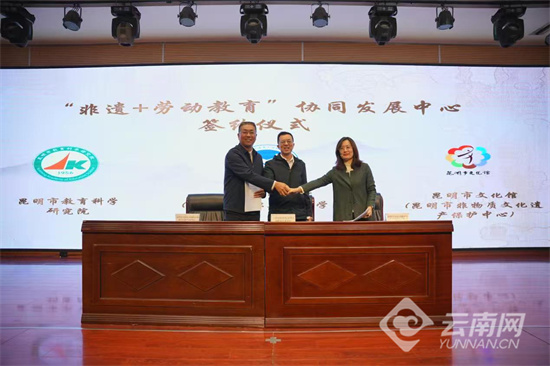 活动中,云南技师学院为捐赠作品的非遗代表性传承人颁发了收藏证书,并为参展传承人颁发展览证书。随后,学院与昆明市教育科学研究院、昆明市文化馆(昆明市非遗保护中心)共同签署合作协议,正式成立“非遗+劳动教育”协同发展中心,携手推动非遗融入校园与课堂。
