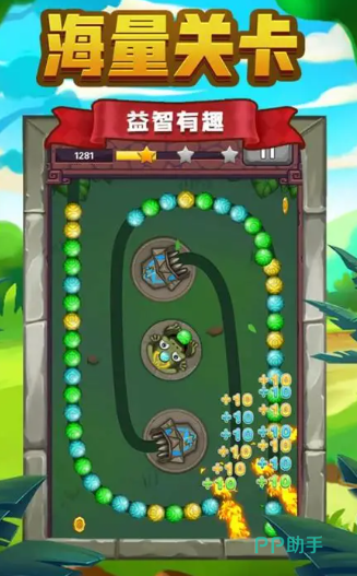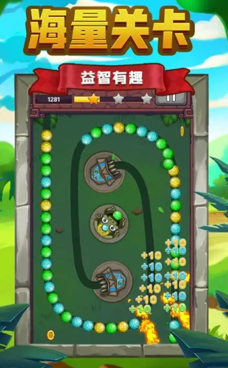游戏以玛雅文明为背景,将经典弹珠消除玩法进行深度拓展。基础三消规则保持简洁,新增彩虹珠可替代任意颜色完成匹配;中后期关卡引入动态旋转轨道与分支路径,要求玩家预判弹射角度与顺序。通关指定章节后开放守护模式,通过图腾触发范围清除效果,显著增强策略维度与操作反馈。