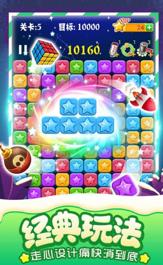 游戏采用极简主义UI设计,主界面铺满多色星形图标。规则清晰:点击相邻两个及以上同色星星即可消除,消除数量越多得分越高。无体力限制、无强制社交、无内购干扰,纯粹依靠空间预判与连招规划提升成绩。视觉反馈流畅,星星逐级坍缩的动画带来显著解压效果。