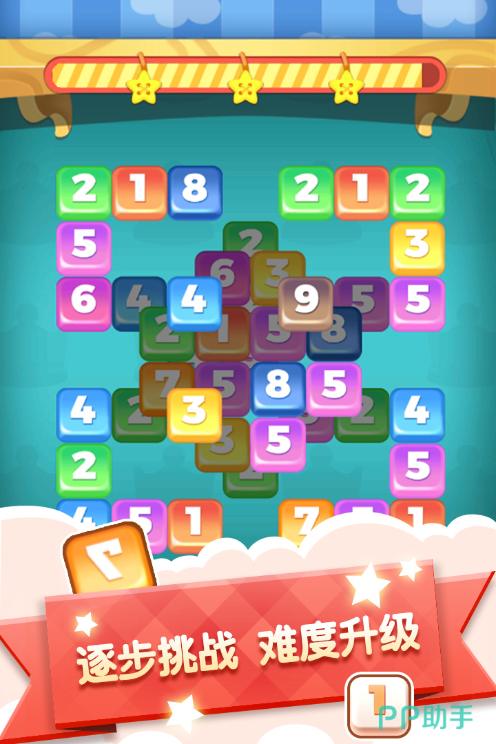 本作采用创新的“三点一线”合成规则,玩家需选取三个或以上相同数字方块,在指定路径上完成组合,达成关卡目标数值。游戏内置七大主题场景,涵盖不同图形样式与色彩序列;每个目标值配有实时进度条,并在界面底部固定提供5个待选数字方块,有效缓解合成卡点问题,提升操作容错率与解题自由度。