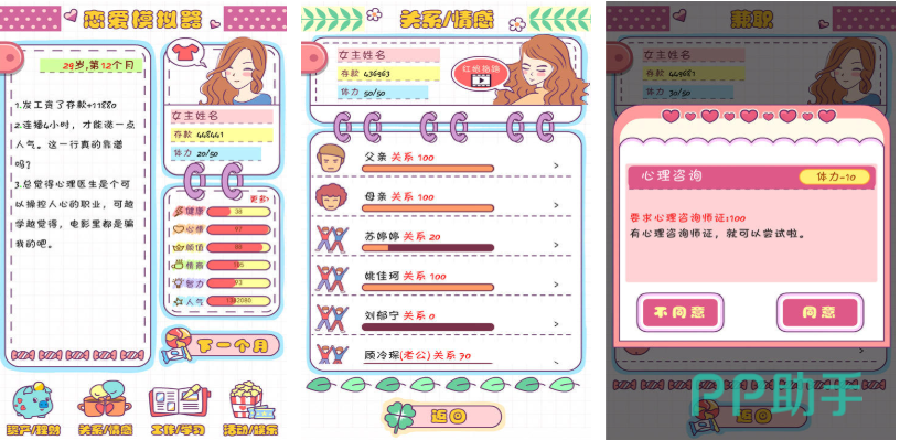 采用文字冒险(Visual Novel)形式构建恋爱叙事,以女性视角展开多线剧情。游戏通过日记体记录、环境描写与心理独白强化临场感,每个选项均影响角色关系走向与结局分支。虽无直接肢体互动建模,但文字对亲密时刻的刻画细腻入微,配合沉浸式配音与背景音乐,营造出极具代入感的情感成长路径。