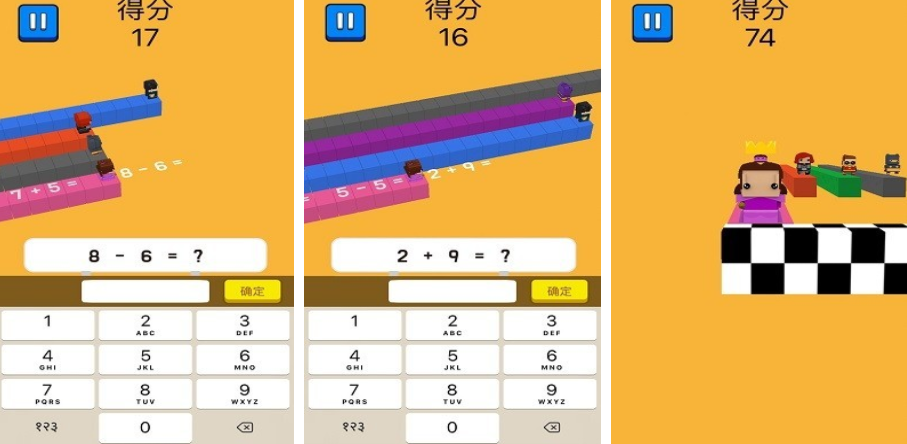 区别于静态合成类玩法,本作引入实时竞速机制。每关呈现多道基础算式(加减法为主),玩家须在限定时间内点击正确答案,角色随之前进。四人同场比拼设定增强参与感,有效锻炼心算速度、抗压反应及决策准确性,契合小学低段数学课程标准中的口算能力要求。