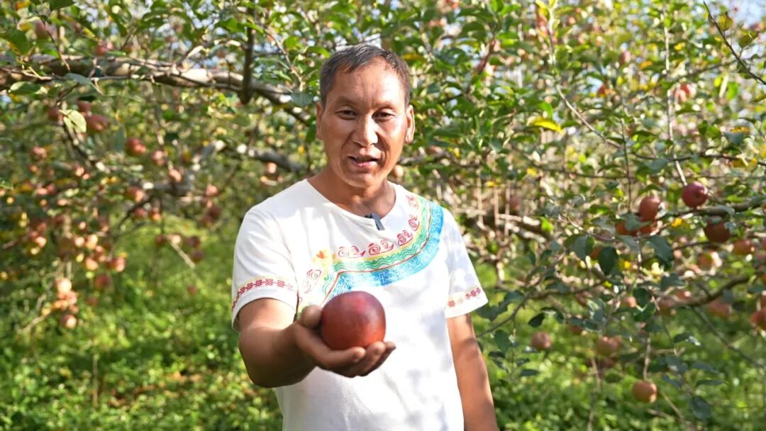 在宁蒗县新营盘乡毛家乡村委会,果农沙长发的苹果园里满是忙碌的身影。他穿梭在果树间,随手摘下一颗苹果,咬开便是脆甜的果肉——这是他种了30多年的成果。如今,沙长发的果园总面积达57亩,其中30多亩已进入丰产期。今年的苹果不仅个头大、糖分足,刚采摘就被外地客商订走了大半。“按照市场价,预计今年收入50万元左右。” 沙长发笑着向记者算起了收益,眼角的皱纹里满是丰收的喜悦。