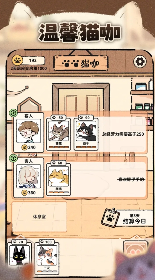 本作融合模拟经营与民俗恐怖题材,玩家将经营一家以“人猫共愈”为理念的猫咪咖啡馆。世界设定中存在不可违逆的怪谈规则体系,例如禁止直视镜中倒影、不可在午夜喂食黑猫等,违反即触发危机事件。玩家需在保障猫咪安全、维系顾客满意度与规避灵异风险之间取得平衡,同时应对房租压力、客流波动等现实经营挑战,最终带领伙伴与猫咪共同逃离影子怪的追猎。整体节奏张弛有度,规则逻辑自洽,营造出独特而沉浸的东方怪谈氛围。