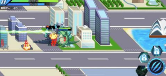 主角为搭载复合武器系统的机甲暴龙单位,采用点击式移动机制控制其在开放城市地图中穿行。所有静态物体(含交通设施、公共建筑、绿化带)均可被摧毁并计入破坏积分。敌对单位实时刷新,左上角显示剩余敌方数量。商店系统支持消耗游戏货币升级暴龙装甲、主炮射速及近战爪击范围,形成线性成长曲线。