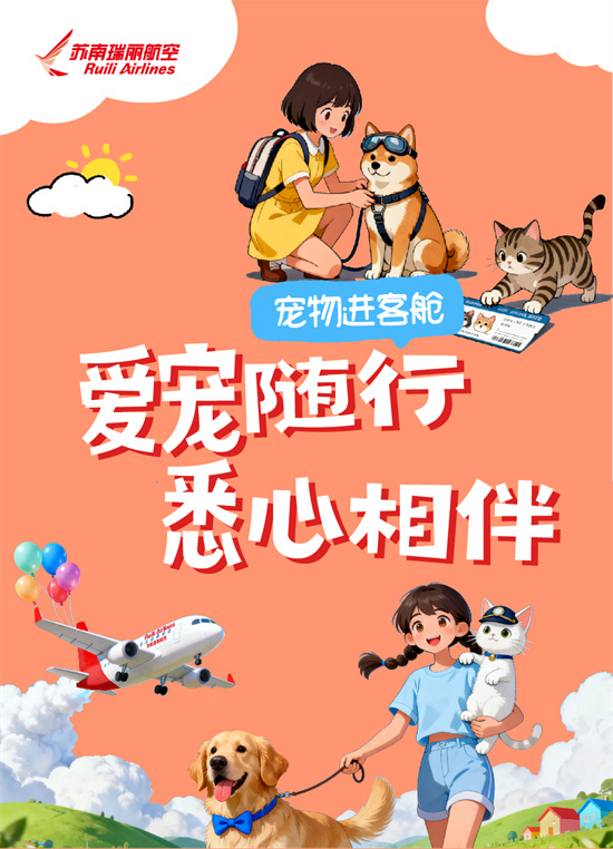 带着“毛孩子”一起坐飞机,自10月26日起,苏南瑞丽航空正式推出“爱宠随行 悉心相伴”宠物进客舱服务产品,解锁宠物出行友好模式,打破宠物只能托运的传统限制,让旅客与爱宠从隔舱相望变为咫尺陪伴。