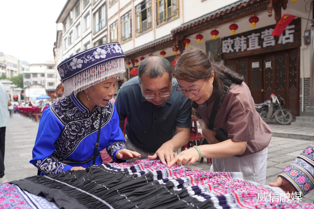 在扎西红色小镇、湾子苗寨等景区,游客们或在非遗传承人指导下,亲手尝试用蜡刀绘制一幅独具特色的苗岭图案,感受指尖上的匠心传承;或观摩参与挑花刺绣,在一针一线中对话历史,将一件件精美的手工艺品作为连接彼此的文化信物;或身着苗族盛装,在芦笙的悠扬旋律中与当地群众共跳团结之舞。
