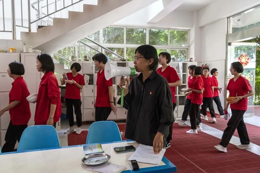 华坪女高食堂,张桂梅拿着小喇叭催促学生们吃饭。(新华社 陈欣波 摄)