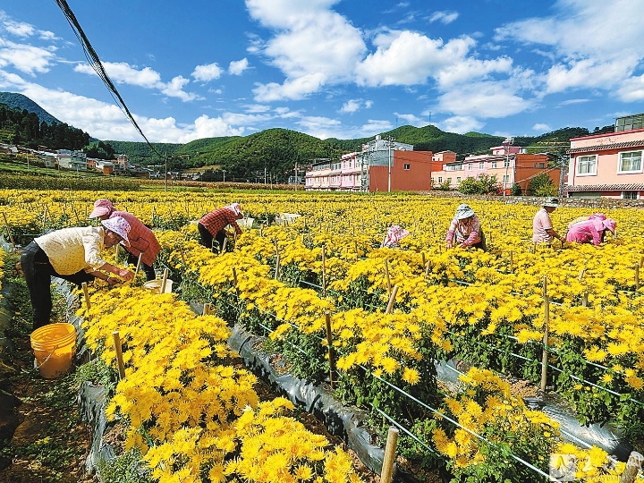 10月,易门县小街乡27亩金丝皇菊竞相绽放,金黄的花朵在阳光下熠熠生辉,工人们穿梭其间,娴熟地采摘着成熟的金丝皇菊。