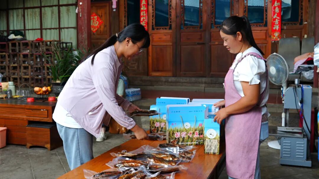 稻花鱼虽鲜,但受季节限制。为了让这份美味与收益“跨季延续”,不少农户盯上了加工环节。在赧等村村民鲁大秀家,一家人正忙着清洗、腌制、晾晒新鲜稻花鱼,制作风味鱼干。“鲜鱼保质期短,做成鱼干能放10个月左右,游客来玩时也方便带回去当伴手礼。”鲁大秀说。