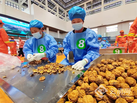 核桃破壳取仁核心在于手快心细、有质有量。按比赛规则,选手两人一组,协作完成6公斤核桃破壳取仁,用时最短、核桃仁两瓣完整、干净、重量最重者获冠军。