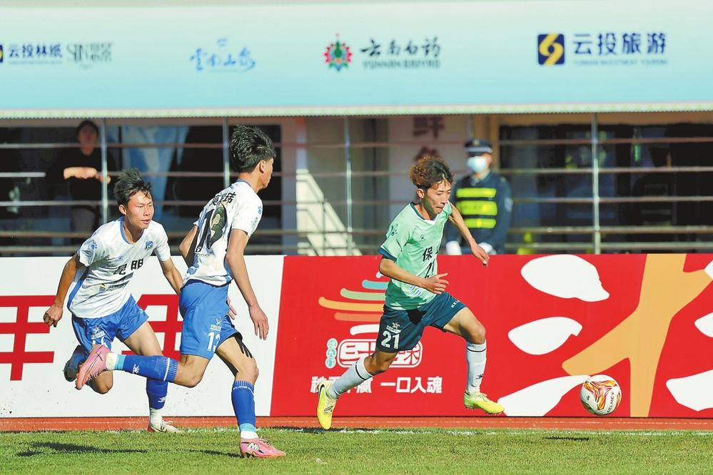 昆明队做客保山奥林匹克体育中心挑战保山队。昆明队开场便发起猛攻,频频向保山队球门施压。保山队则沉着应战、稳固防守,寻找反击良机并率先破门,一球领先结束上半场。下半场,昆明队及时调整战术,频繁创造角球机会,在第73分钟抓住一次进攻良机将比分扳平。此后双方均无建树,在94分钟的常规时间内1:1战平。点球决胜阶段,保山队球员的心态和脚法更胜一筹,以6:5战胜昆明队,赢得赛区开门红。