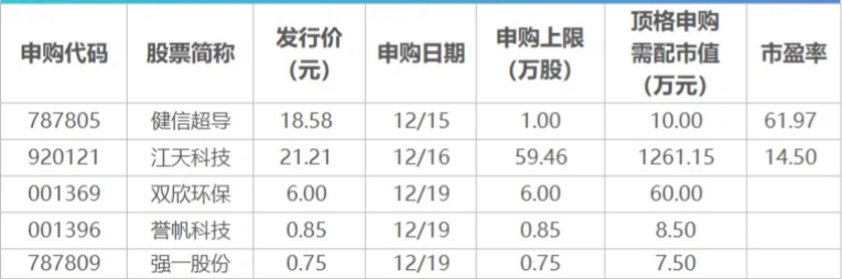 Wind数据显示,本周将有5只新股申购,其中深市主板2只、沪市科创板2只,北交所1只。具体来看,12月15日发行的是健信超导,12月16日发行的是江天科技,12月19日发行的是强一股份、誉帆科技、双欣环保。