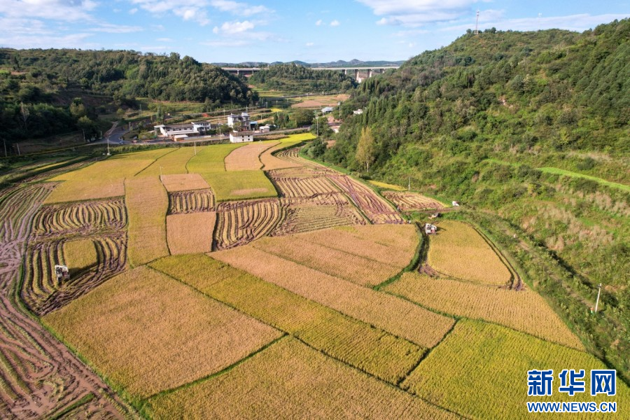 航拍云南省曲靖市麒麟区越州镇舟上村收割水稻(10月12日摄)。新华网发(杨俊鹏 摄)