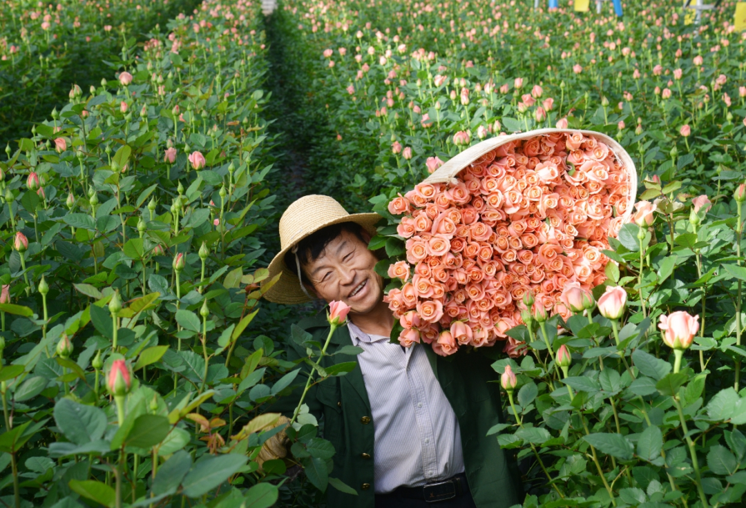 花农在晋宁康龙花卉种植基地采收高品质的粉玫瑰。杨崇云 摄