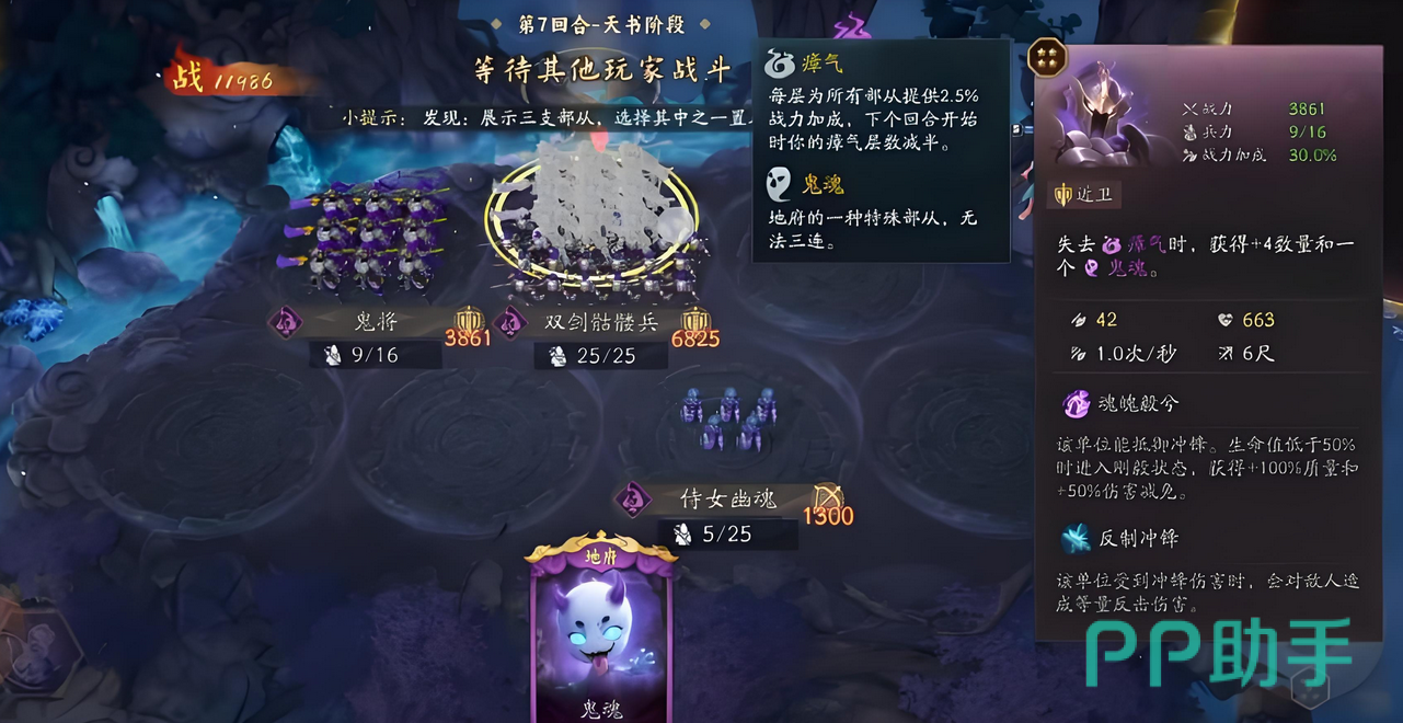 在具体的运营过程中,前期使用阴兵来进行过渡,它的效果是每回合结束都能产生瘴气。还能够触发鬼将技能为战士部从增加数量,中期需要补奈何桥守卫,五岳卫兵等。奈何桥守卫能够提升战士数量,五岳卫兵可以配合小鬼叠加效果。小鬼是很核心的特殊部从,既可以充当战士参与战斗,也是后面召唤阎罗的关键,出售出去之后还能赚取经济。前期要主动找到击杀机会,依靠阴兵等不同的效果快速叠加瘴气,这样能建立起属性压制的优势。中期可以实现部从等级和装备成型,瘴气叠加效率大幅度提升,此时战力到达巅峰,要主动推进扩大战果。