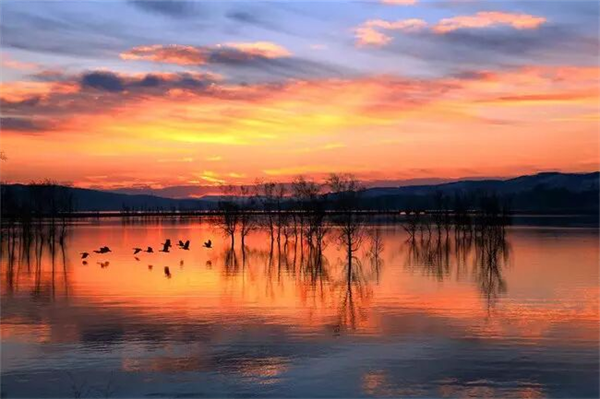 作为高原湿地,念湖的景色从不依赖夸张的修饰,却自带一份沉静的力量。这里的湖水因高原特有的低污染环境而格外清澈,天空也因海拔优势显得格外明朗,二者相映,构成了念湖最动人的底色。不同季节里,念湖有着不同的面貌:春日沼泽地萌发新绿,夏日湖面倒映蓝天白云,秋日草甸渐染金黄,冬日则因候鸟的到来多了几分生机。而一天之中,日落时分的念湖最受摄影师青睐——夕阳穿过云层,在湖面上铺展开细碎的金光,湖边几株枯树静静伫立,拖着被斜阳拉长的影子,云蒸霞蔚间,是高原独有的壮阔与静谧。