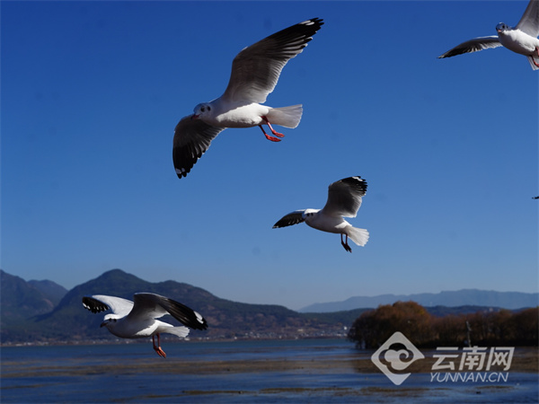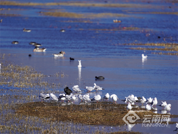 拉市海作为滇西北重要的候鸟越冬栖息地,凭借温暖湿润的气候、充足的水生生物资源,每年吸引大量候鸟驻足。此次实地拍摄中,记者先后捕捉到红嘴鸥、灰鹤、赤麻鸭等十余种鸟类的活动场景:成群红嘴鸥在湖面嬉戏觅食,灰鹤舒展羽翼掠过湿地,赤麻鸭结伴在浅滩休憩,动静之间尽显自然生机。