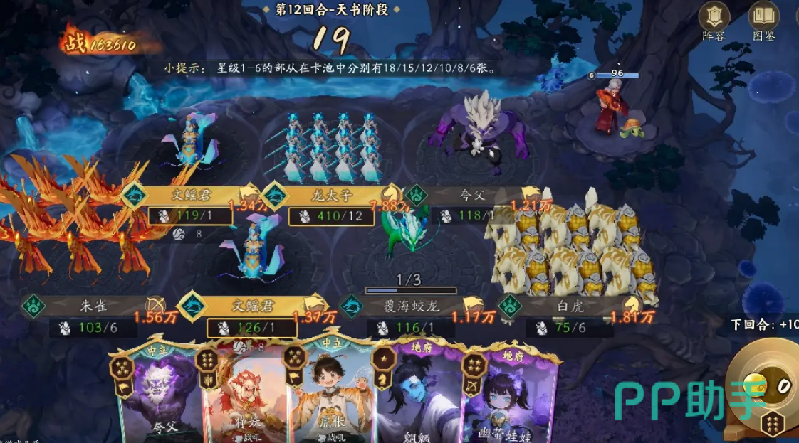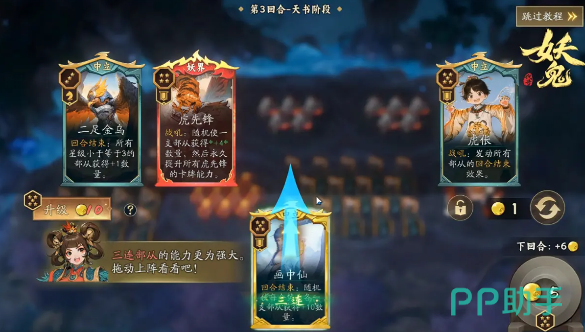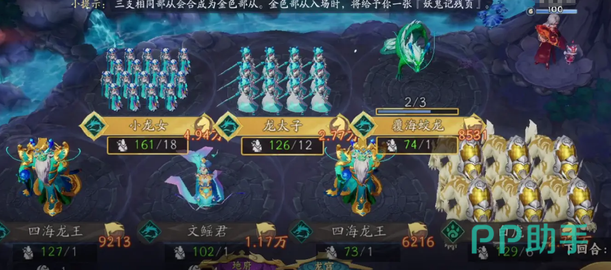 中期的时候,也就是第二至第三回合的时候,我们可以集中招募龙太子,同时保留小龙女作为自己的备选,经济卡适度购买,目的是维持自身的手牌资源,不用过早升本,在协同的组件方面,我们可以去加入四海龙王,这样就可使“回合结束”效果触发两次,如此一来也能大幅度的提升玩家在前期阶段的扩张速度。