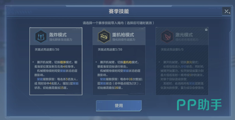 然后是重机枪模式,这个模式能让机械臂切换为重机枪模式,能维持重机枪模式的时间和玩家聚能的层数有关系,在聚能上需要切换为重机枪后命中的次数来聚能,每10个算1层。玩家想要选择这个模式需要有较好的射击能力,还想要刷一刷游戏中各类赛季排名的玩家,就选择这个技能。