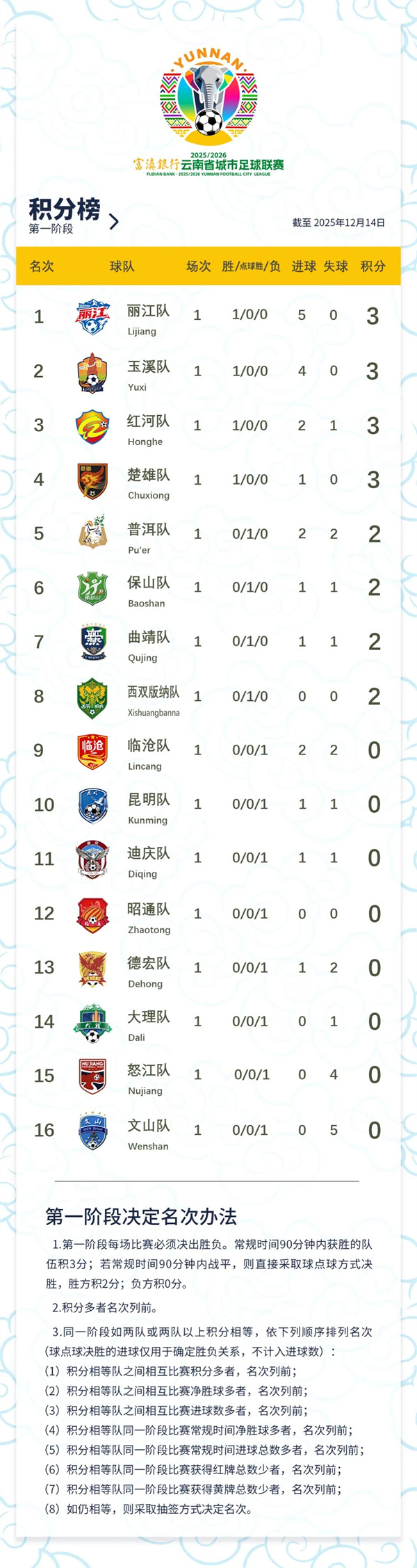 云南网讯(记者 贺凯)12月15日,2025/2026赛季富滇银行云南省城市足球联赛第一阶段的积分榜已新鲜出炉,截至12月14日,丽江队位居榜首,联赛竞争格局已初步显现。