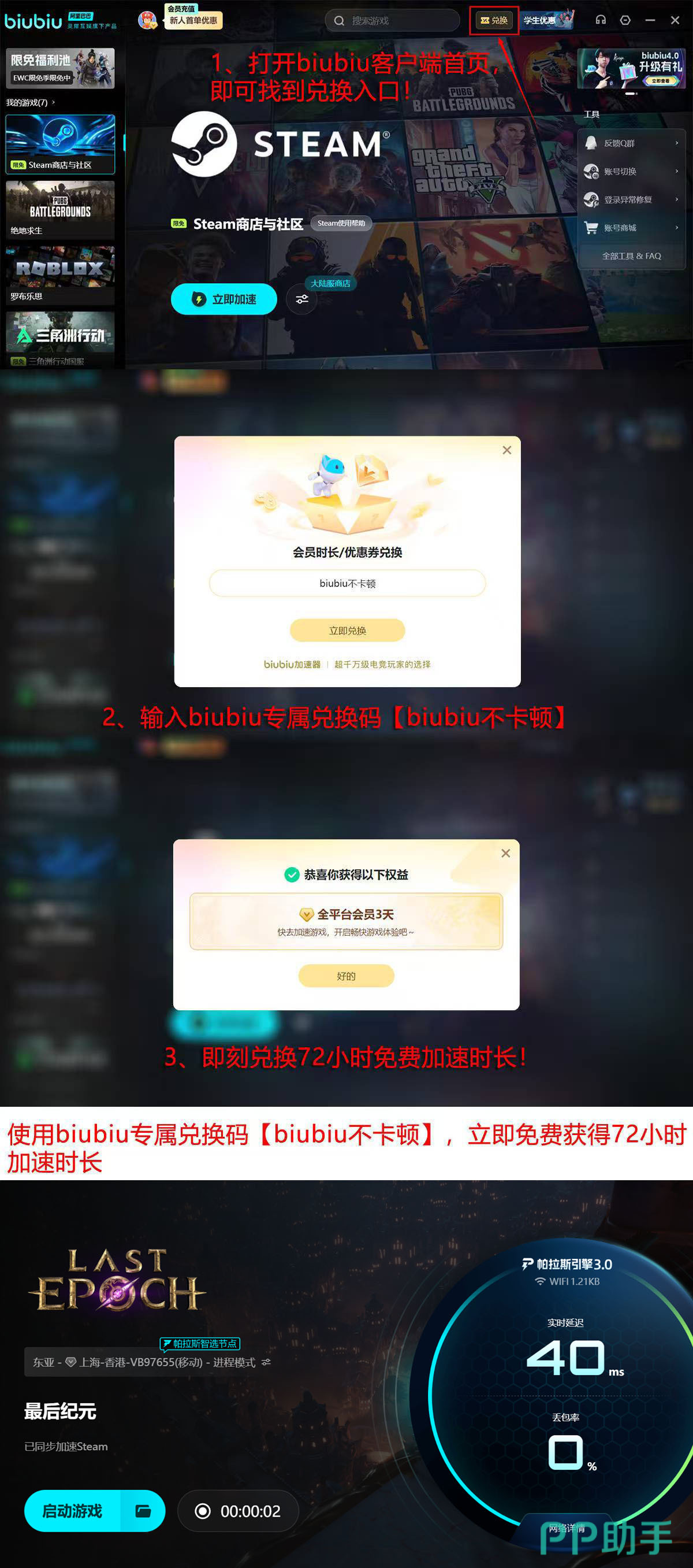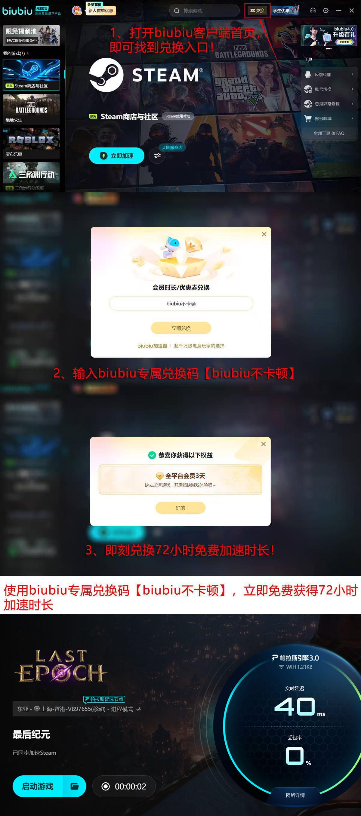 使用biubiu加速器后,《最后纪元》的全流程交互响应将获得实质性改善:从装备词缀随机生成的实时反馈,到高密度怪物群战中的技能释放判定,再到PvP对战中的动作同步精度,均能维持稳定帧率与低延迟表现。目前新用户注册即可获赠24小时免费加速时长;另可通过会员中心输入口令【biubiu不卡顿】,在已登录客户端内兑换额外72小时服务。两项权益叠加,新账号总计享有96小时无门槛体验期。