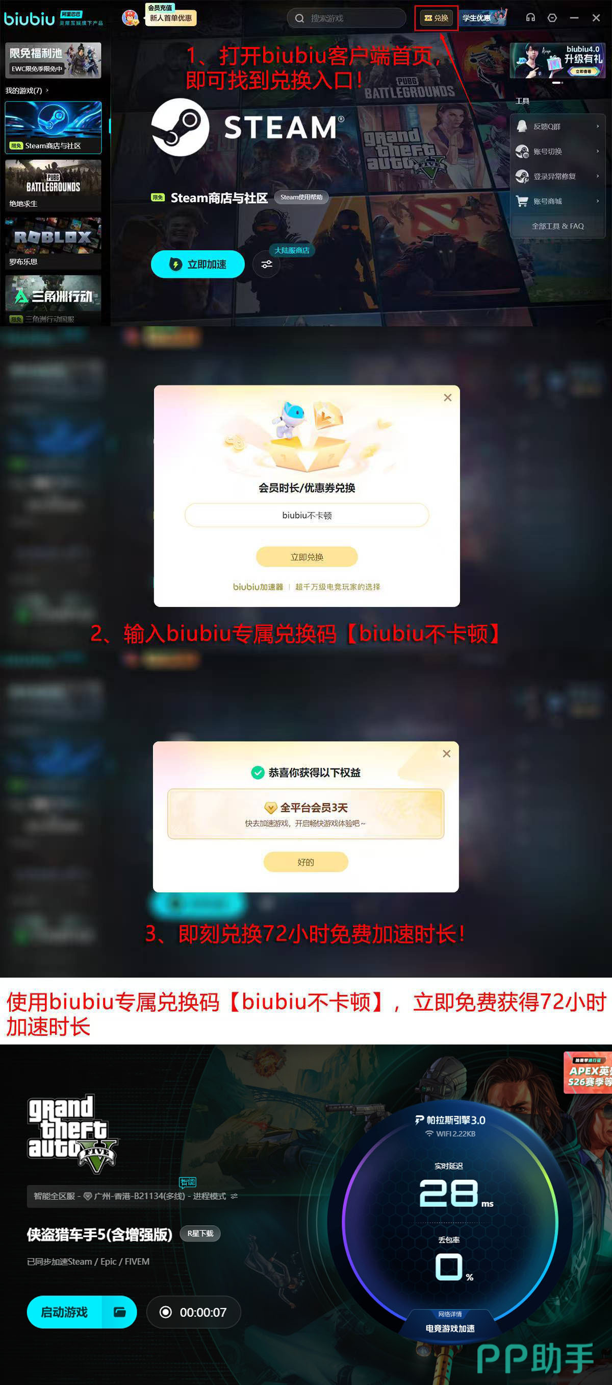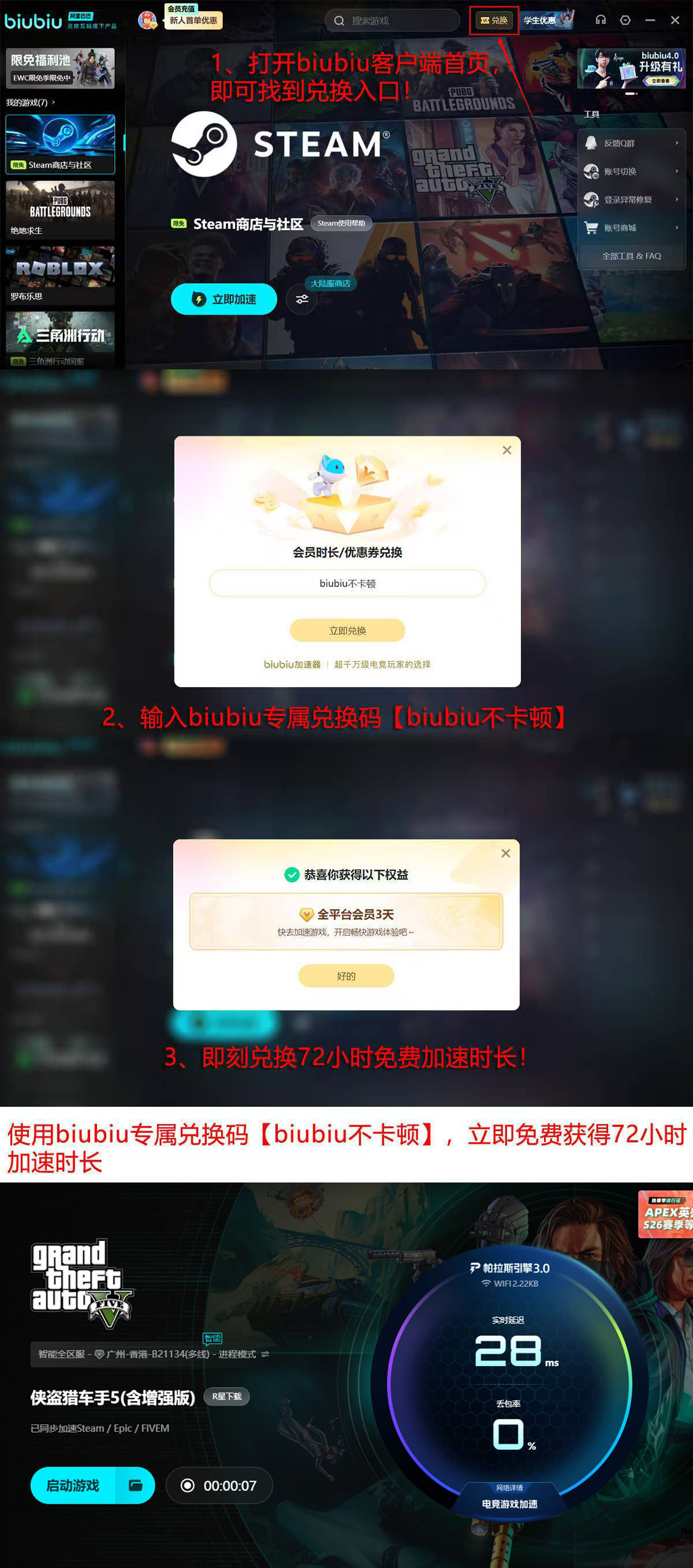 启用biubiu加速器后,GTA Online的全流程网络体验得到全面提升:从账号登录、角色载入,到街头竞速、帮派火拼等高并发交互场景,均可保持低延迟、零卡顿的稳定状态。对于新用户,完成注册即可立即领取24小时免费加速时长;升级为正式会员后,还可参与限时福利活动——在首页输入口令【biubiu不卡顿】,即可兑换额外72小时加速权益,累计可享96小时无限制使用体验。