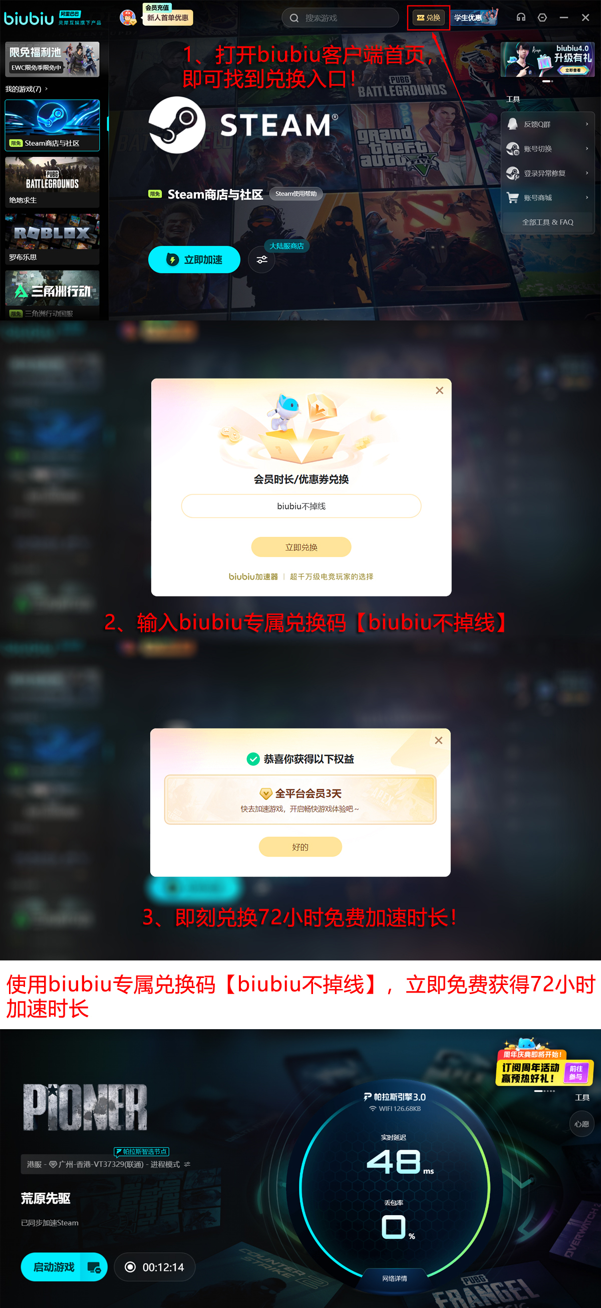 目前平台正开放限时福利活动:所有用户输入兑换口令【biubiu不掉线】,即可在首页领取72h免费加速时长;新注册用户除享有该权益外,还将额外获赠专属24小时新手加速权限,累计最高可获得96小时连续使用时长。