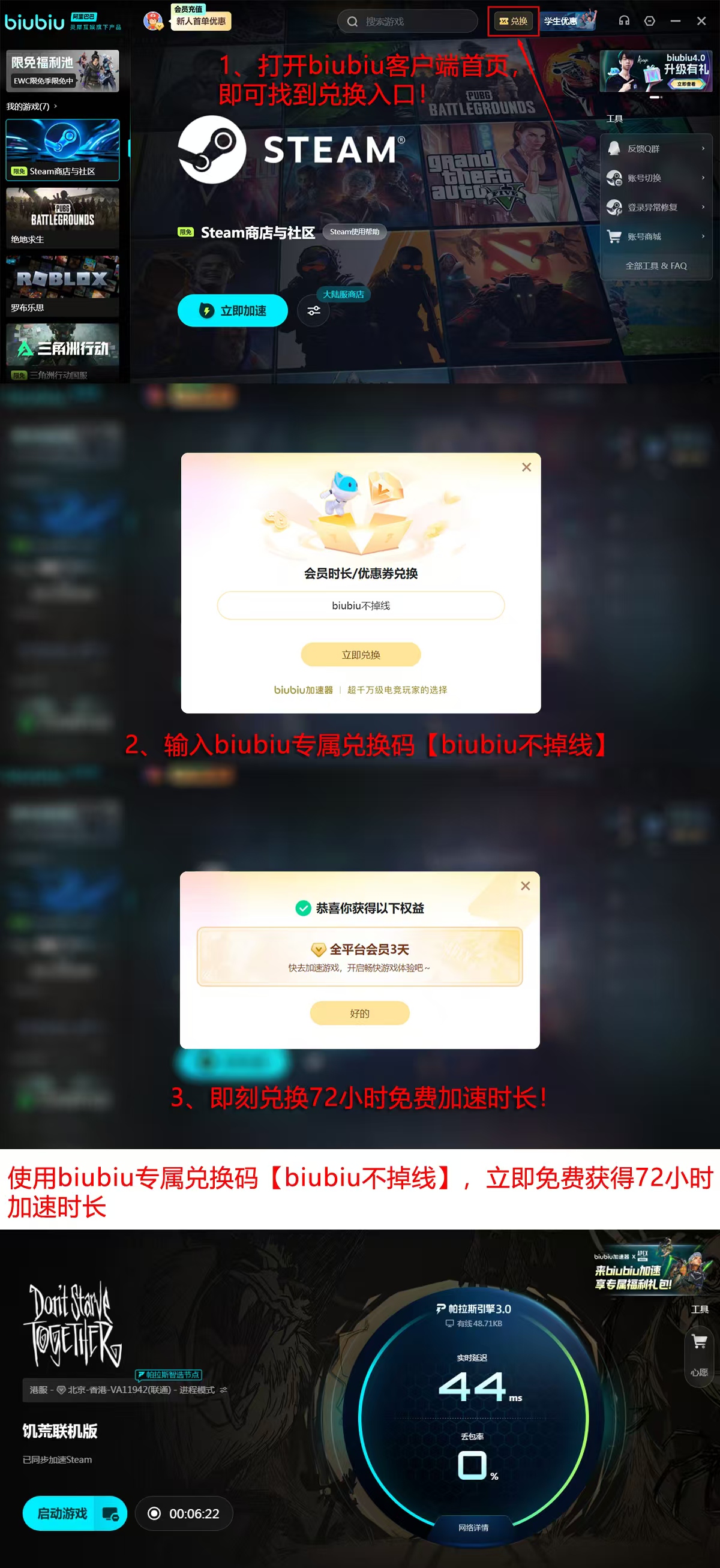 新用户注册后即可立即启用首日免费加速服务,时长为24小时;另可在指定活动页输入口令【biubiu不掉线】额外领取72小时加速权益。两项叠加,总计可享96小时无门槛优质加速体验,无需绑定支付方式,无需完成繁琐任务。