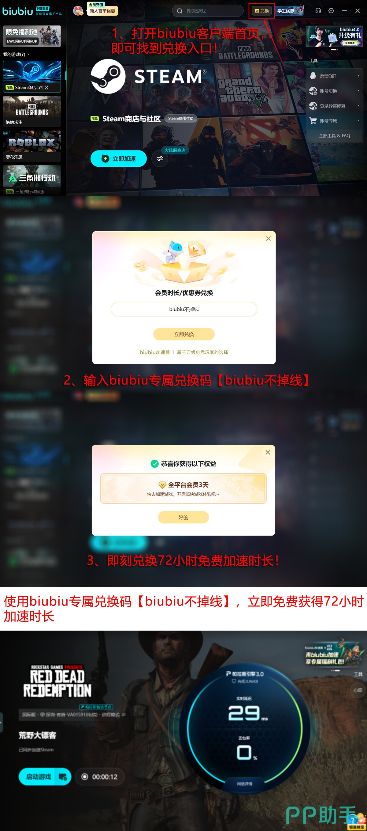 新用户注册即可领取首日24小时全功能免费试用权益;另可通过指定活动页面输入专属口令【biubiu不掉线】,额外获取72小时高效加速服务。两项权益叠加后,总计可享96小时无限制加速体验,助力玩家在广袤西部地图中实现零感知延迟、精准命中与无缝交互。