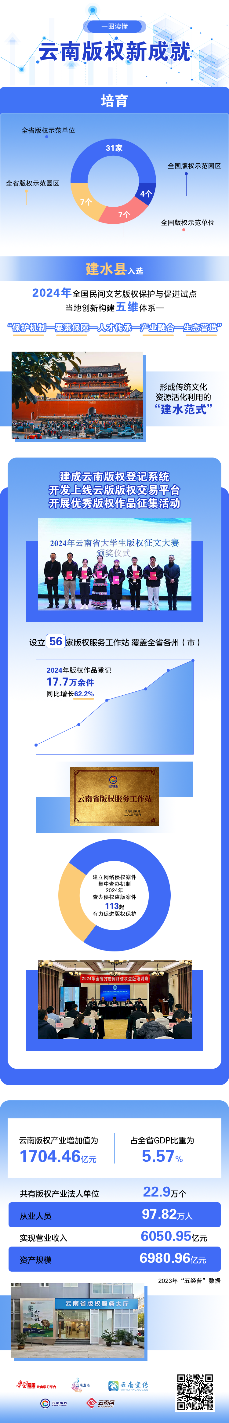 在版权政策和服务体系的保护下,云南文化产业迸发活力,非遗、文创、影视、音乐、出版物、数字产品等领域的版权成果丰硕,历史文化、民族文化、革命文化、自然文化在版权的赋能下,焕发新的活力,展现新的价值,迎来新的时代机遇。