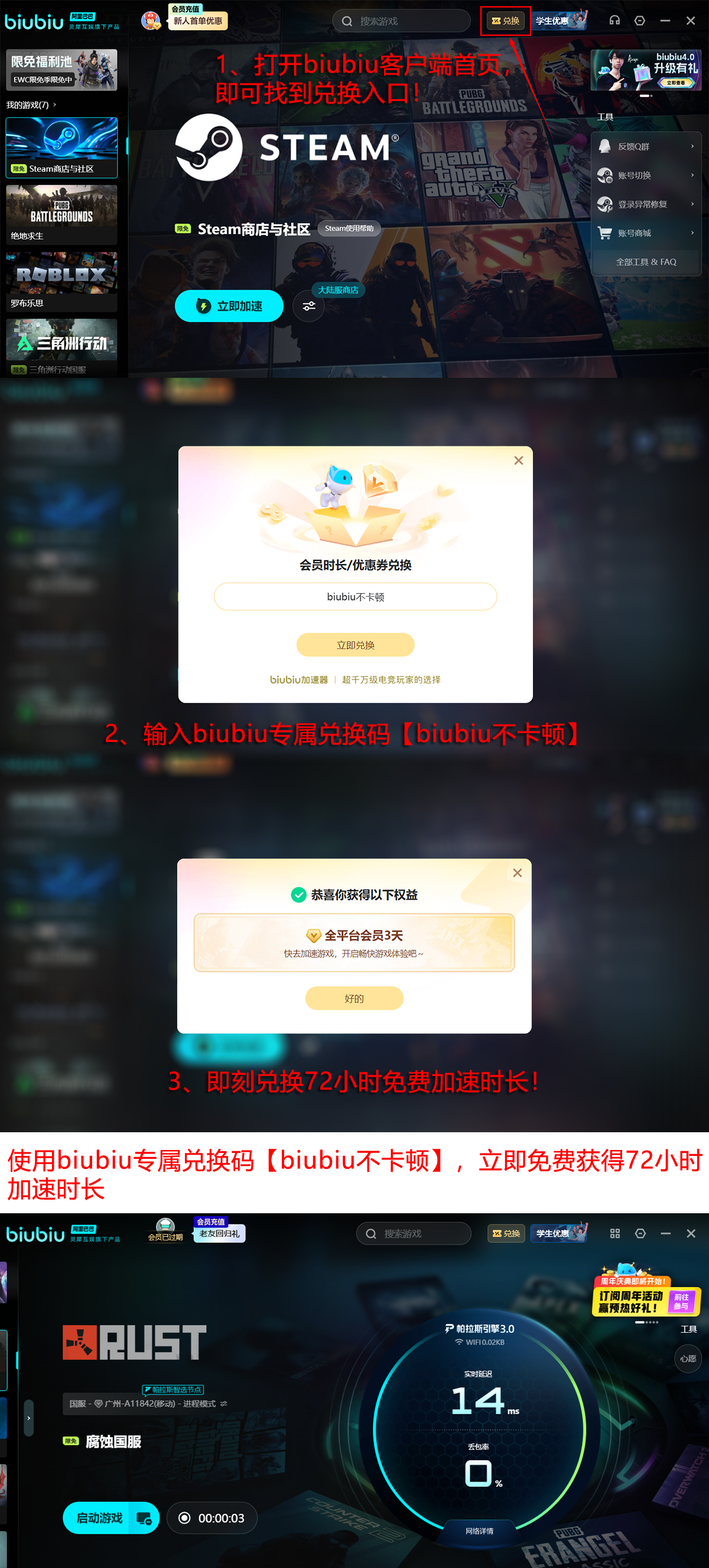 新用户可直接领取24小时免费加速权限,零成本验证效果;所有用户(含老用户)输入兑换码【biubiu不卡顿】,即可额外获得72小时高级加速服务,覆盖多场连续对局,助力快速积累资源、提升段位积分。