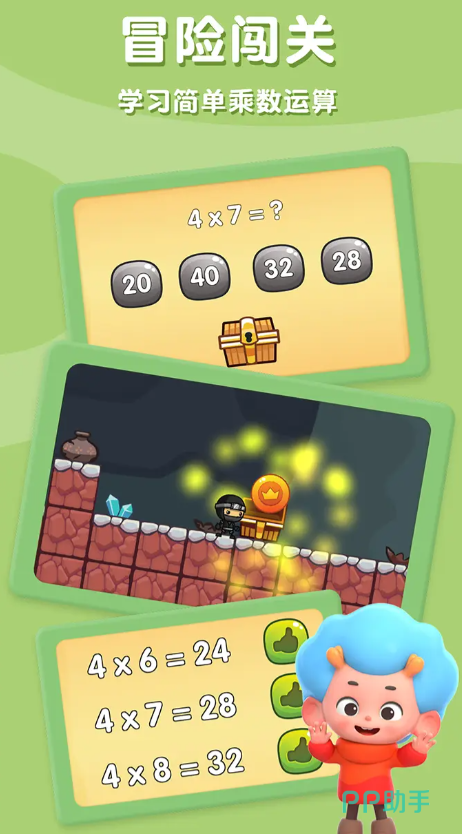 专为掌握乘法口诀设计的沉浸式冒险游戏。玩家扮演探险角色,在地图中探索隐藏路径、开启宝箱、解锁新区域,所有操作均需正确完成指定乘法题才能推进。题目难度随关卡递进,覆盖1×1至12×12全表范围,配合即时反馈与正向激励机制,帮助儿童在重复练习中自然内化运算规则,显著降低对机械背诵的抵触情绪。
