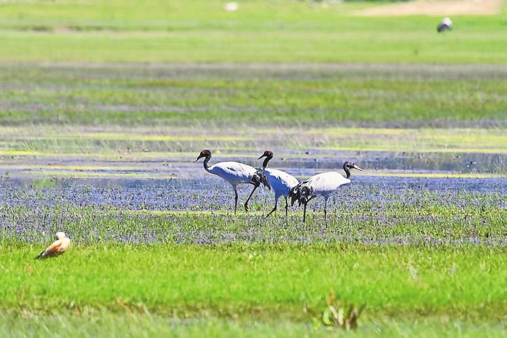 黑颈鹤在纳帕海湿地觅食 通讯员 陈志明 摄
