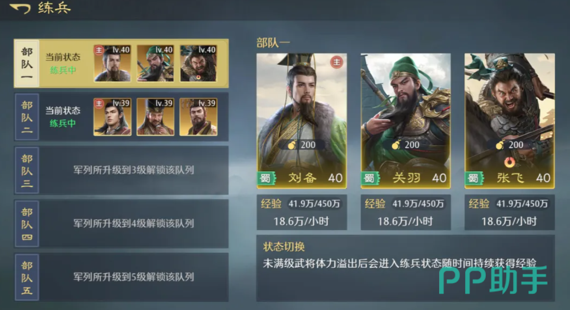 而不同的部队之间的武将获得经验属于按劳分配,因此建议大家把多余的体力用来单队出征,去击打流寇这样在经验上会更加划算点,当然如果大家没有时间忘记了上线也可以依靠练兵功能,在体力溢出后自动获取经验。
